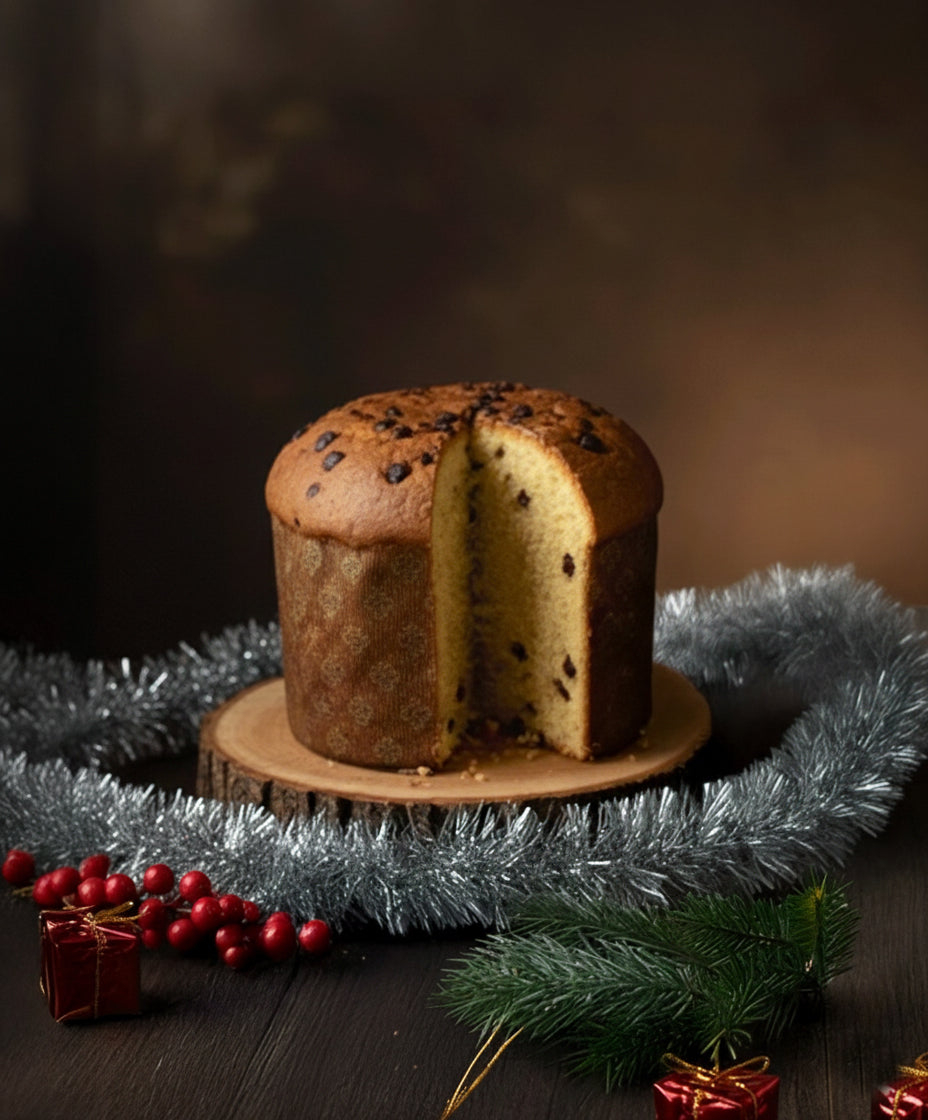 Panettone is a traditional Italian sweet bread, soft and airy, filled with candied fruits and raisins.